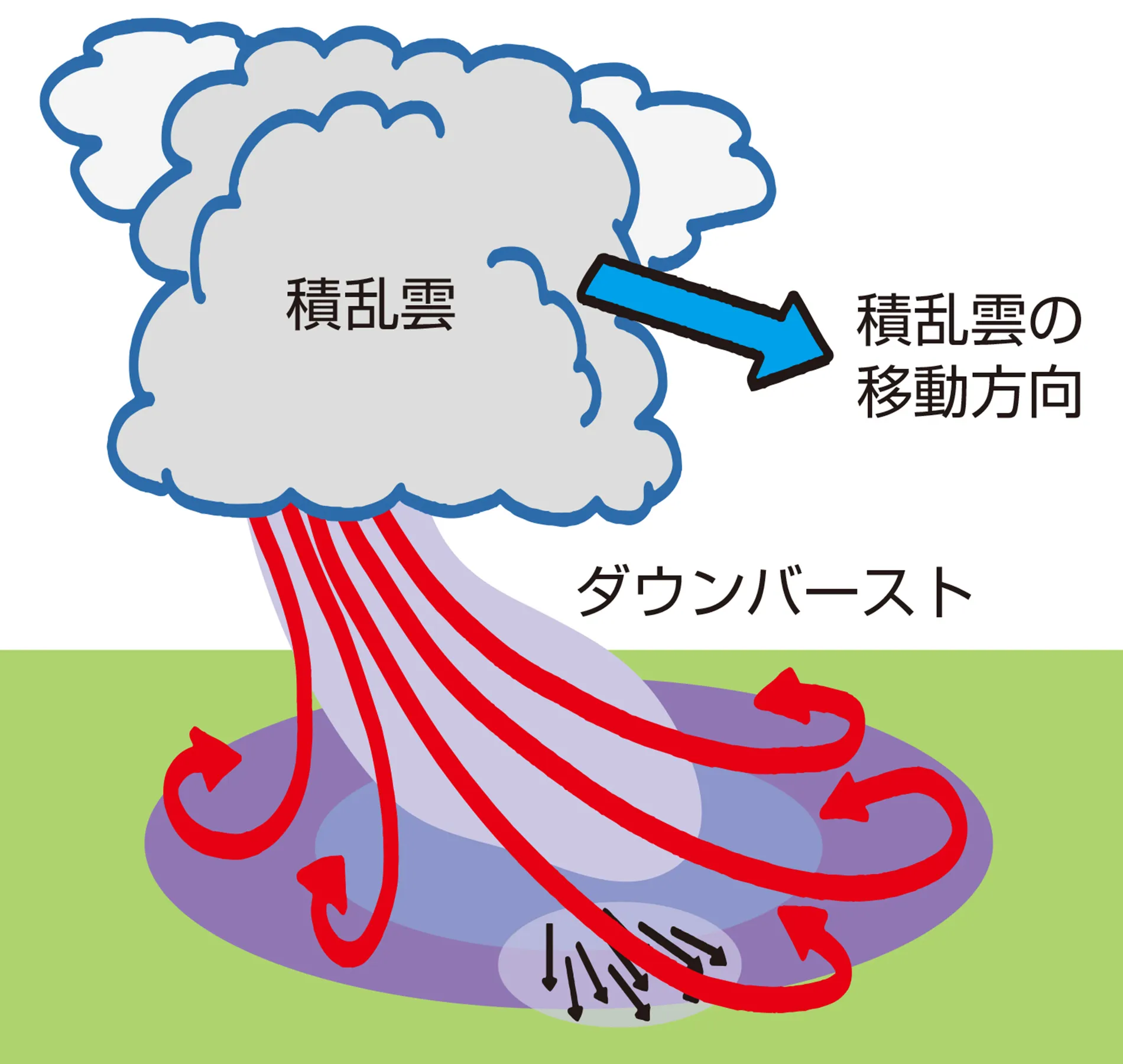 ダウンバーストが生じる原因は、積乱雲内の降水粒子が上昇気流に支えきれずに落下するときに、周囲の空気を一緒に引きずり下ろすためです。