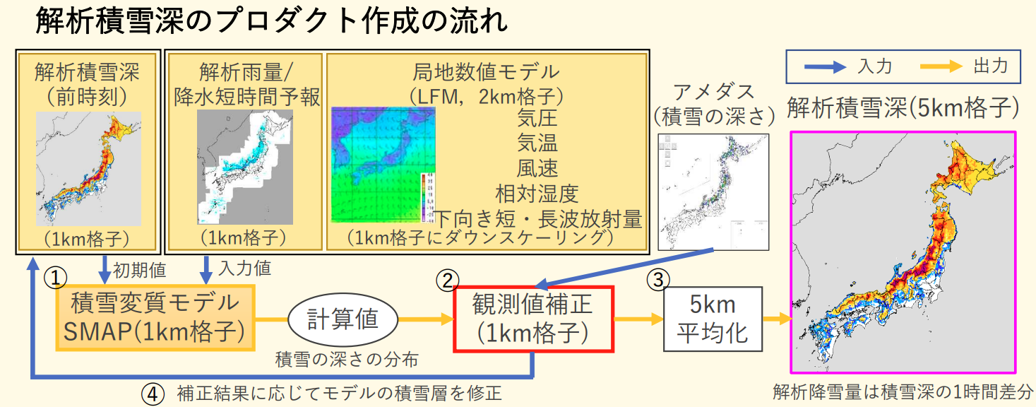(問題)解析積雪深は、解析⾬量や数値予報モデルの気温や⽇射量などを積雪変質モデル(約 1km 格⼦) に与えて積雪の深さを推定し、その値をアメダスの積雪深計の観測値により補正した上で、約5km 四⽅の平均的な値として作成されている。