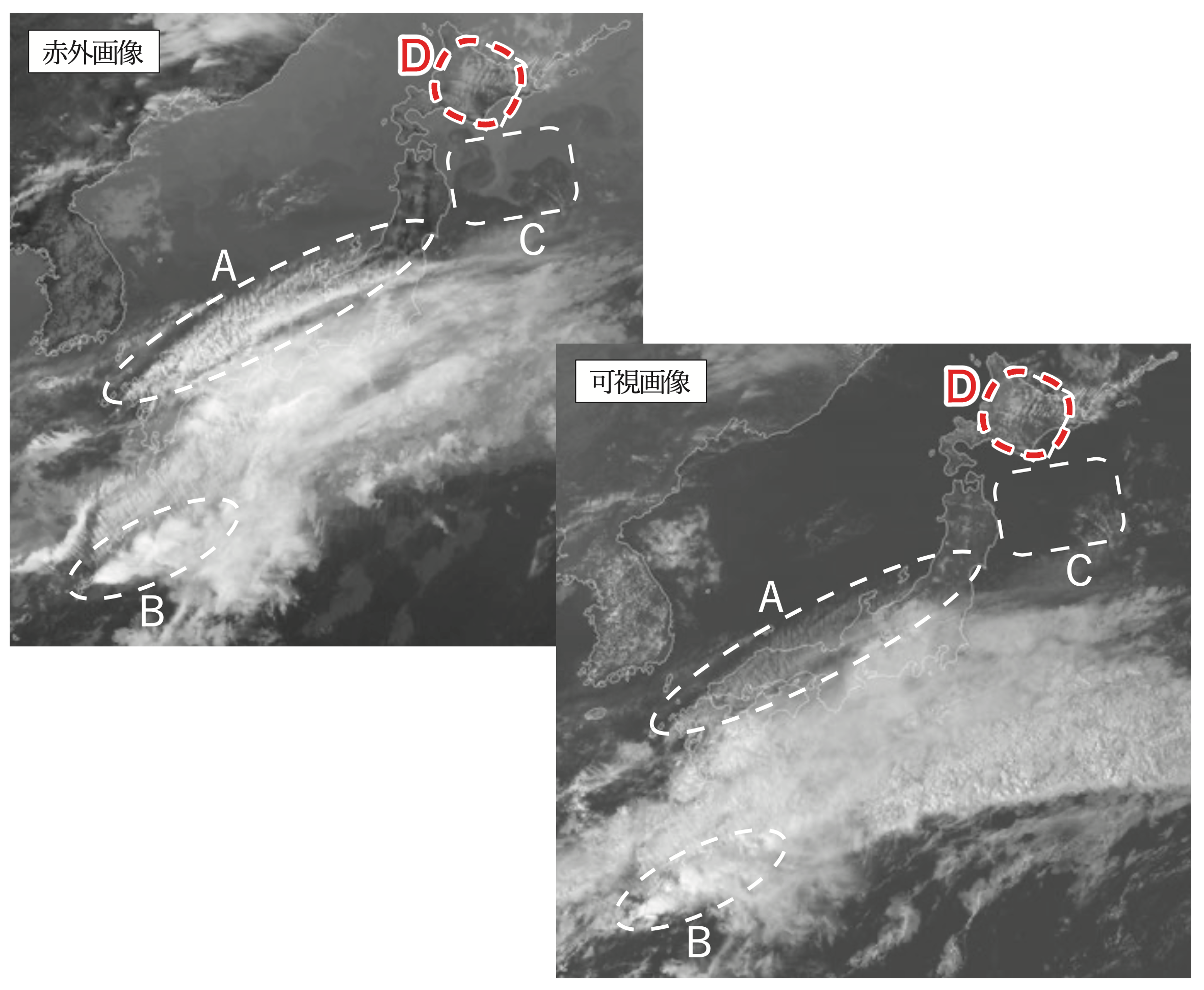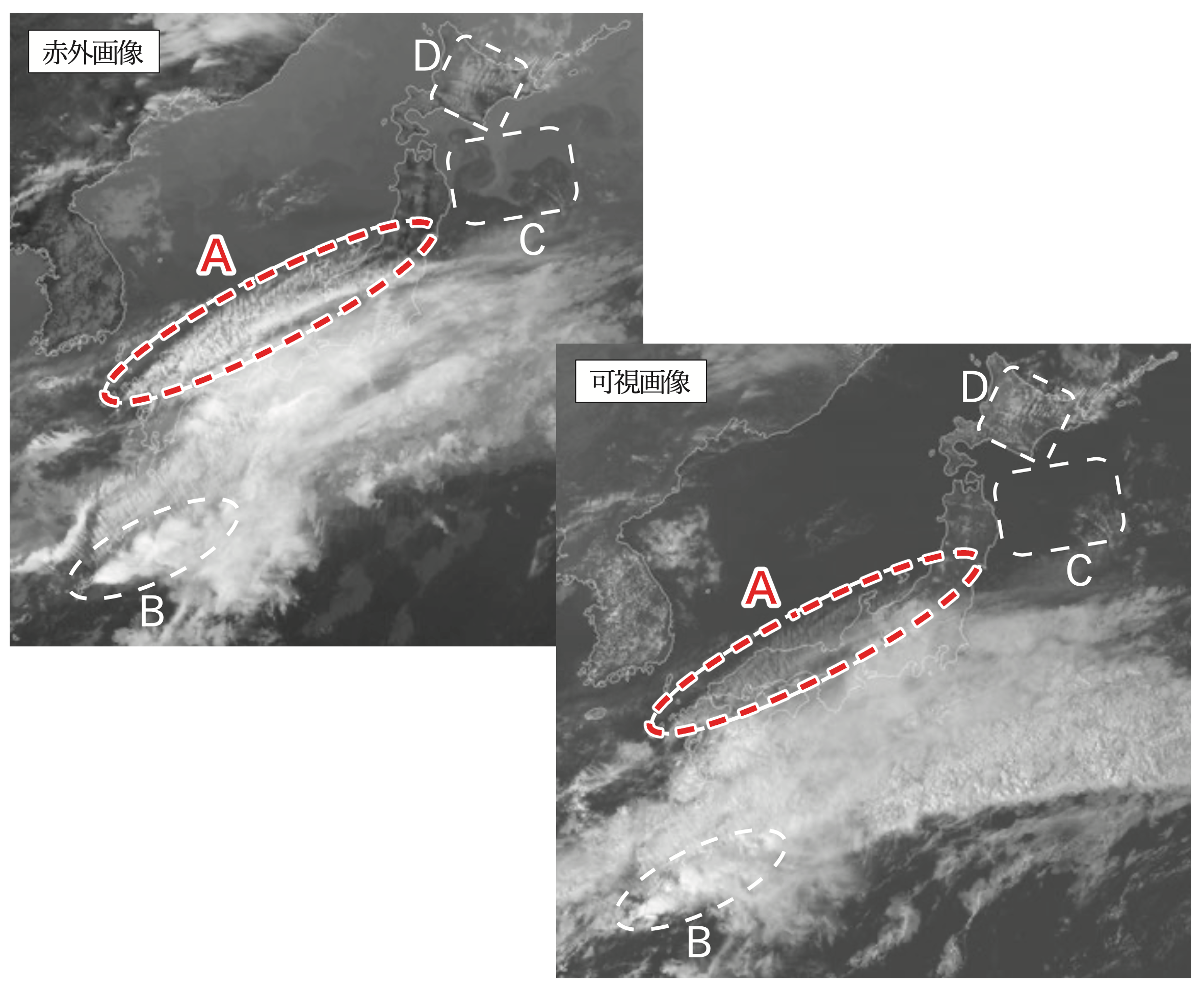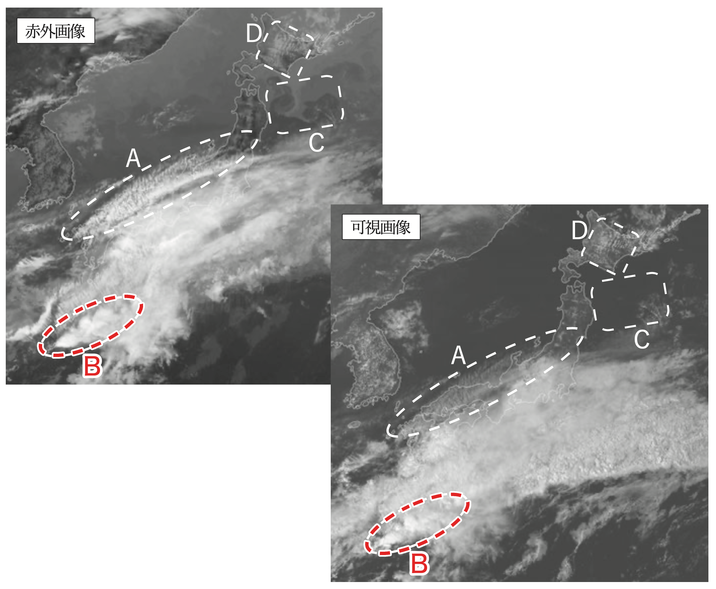 領域 A は、赤外画像で明るく可視画像でやや暗いため、上層雲であることが分かります。
