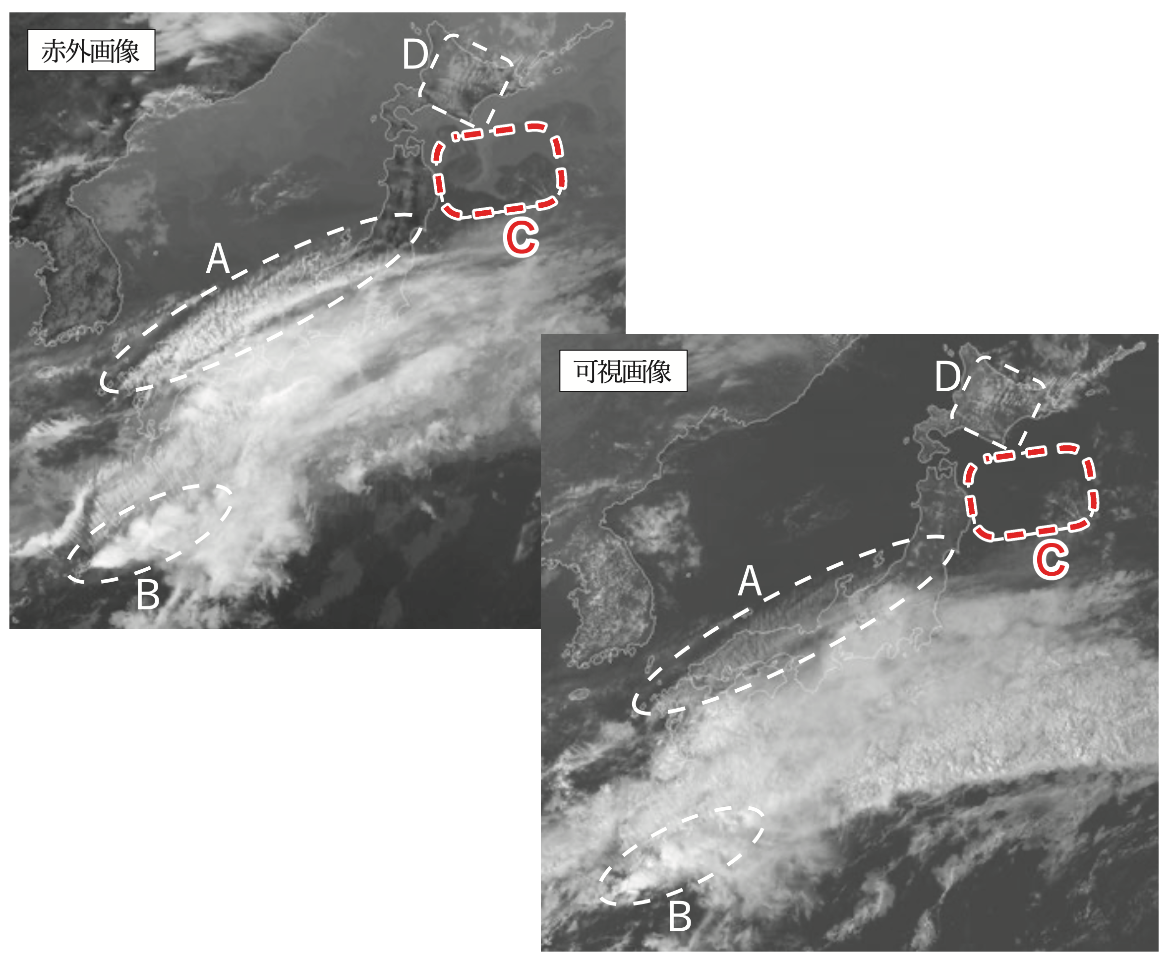 したがって、領域 C には、赤外画像で暗灰色と黒色の境界が見られるが、可視画像では同様な境界が確認できないことから、この境界は海面水温の違いによって現れたと推定されますので、答えは となります。