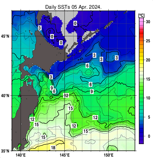画像:気象庁ホームページ「親潮域の海面水温(2024年4月5日)