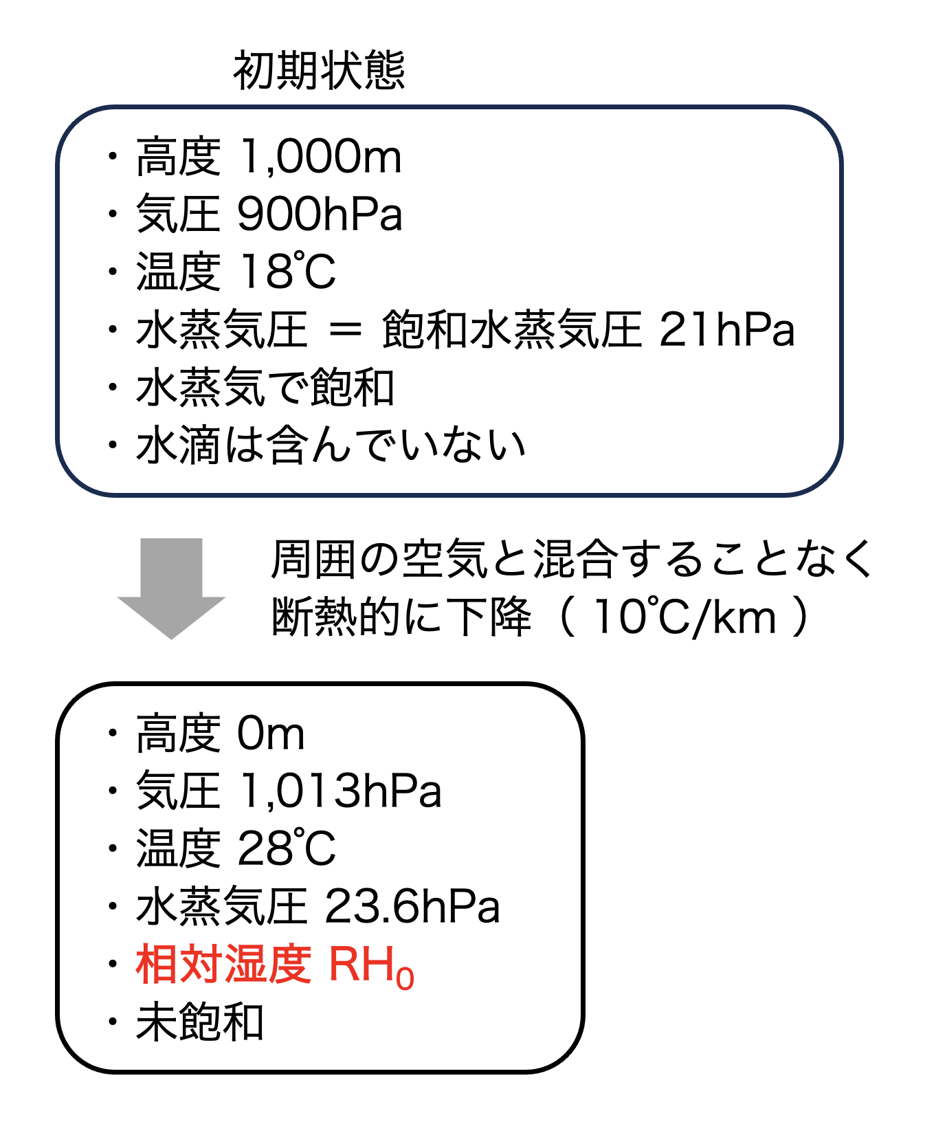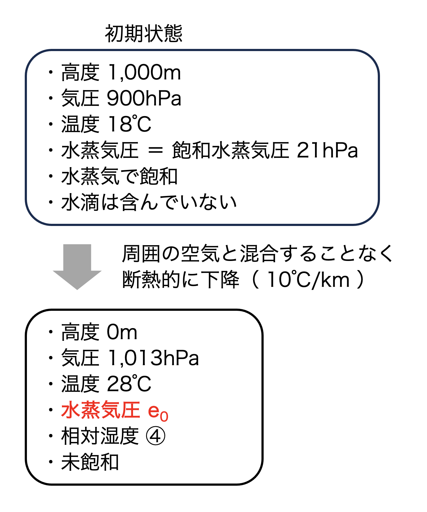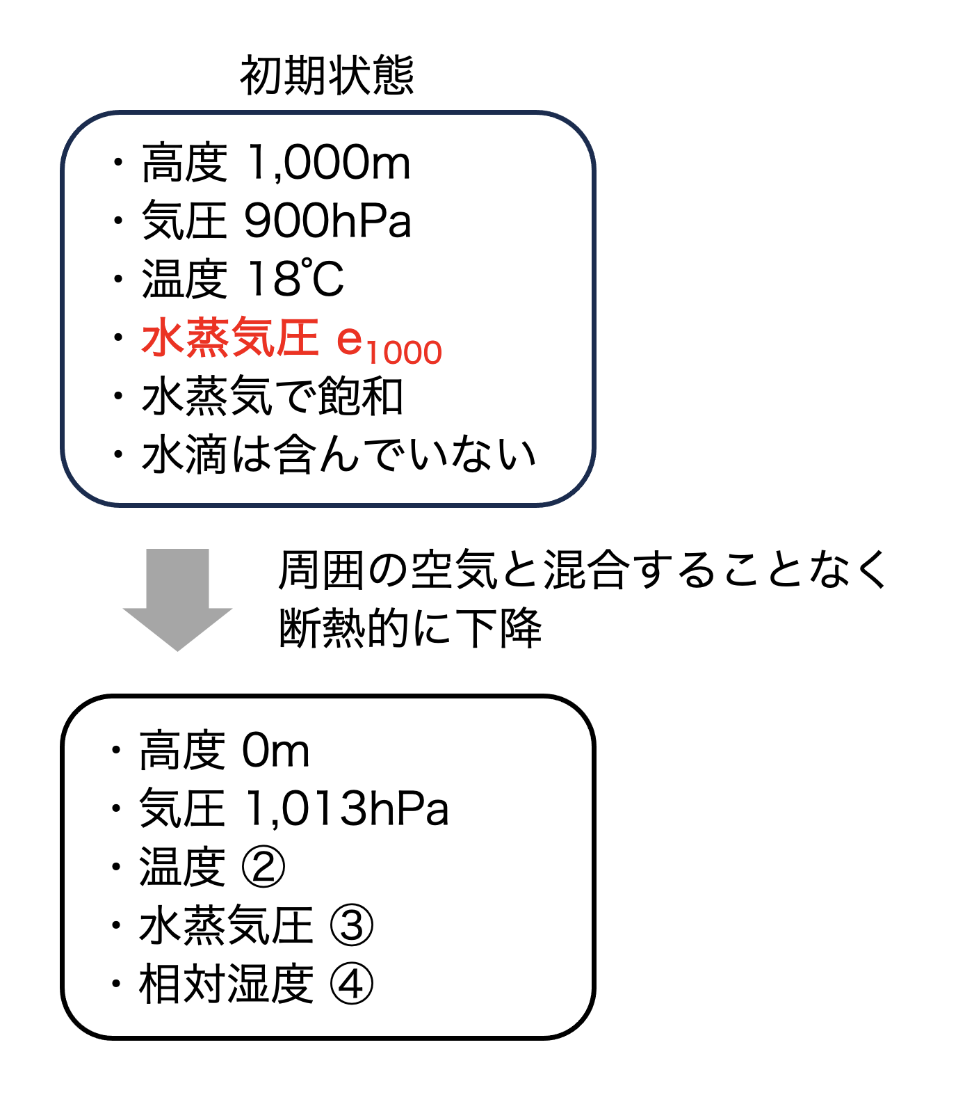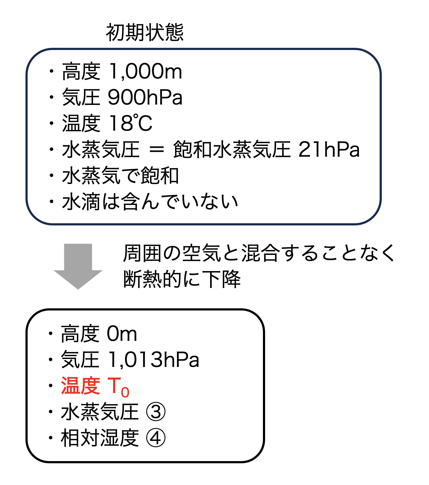 問題文より、空気塊は水滴を含まず(凝結せず)、周囲の空気とも混合せず、断熱的に下降します。